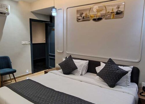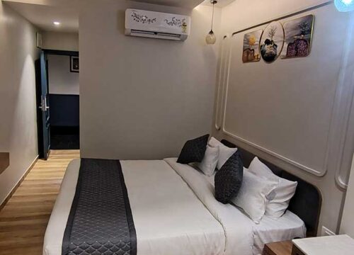 Our Deluxe Room is designed to pamper you with luxurious amenities, including air-conditioned comfort, a well-appointed bathroom with hot and cold water, toiletries, and a hairdryer. Quench your thirst with mineral water, and stay connected with our telephone and TV facilities. Our stylish modern decor and king-size bed with premium linens ensure a truly regal experience.